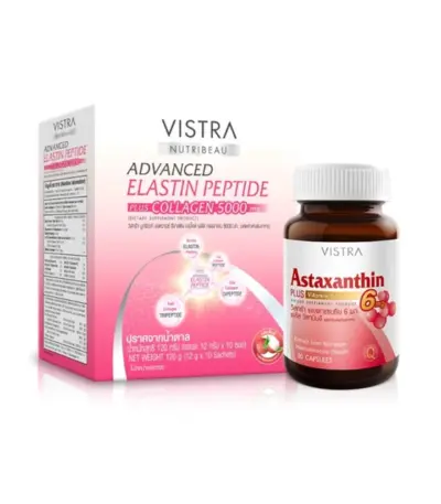 VISTRA Dietary Supplement Nutribeau Advanced Elastin Peptide Plus Collagen 5000 mg. 12 g. 10 sachets + Astaxanthin 6 mg Plus Vitamin E 30 Tablets x 2