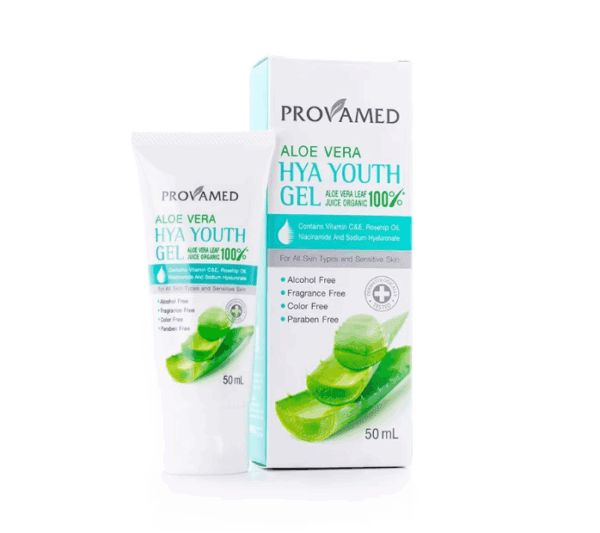 - Provamed Aloe Vera Hya Youth Gel product is a clear gel. In riches of Aloe Vera Leaf Juice Organic 100%., Vitamin C & Vitamin E and Rosehip Oil. It helps anti-oxidant and soothing skin.