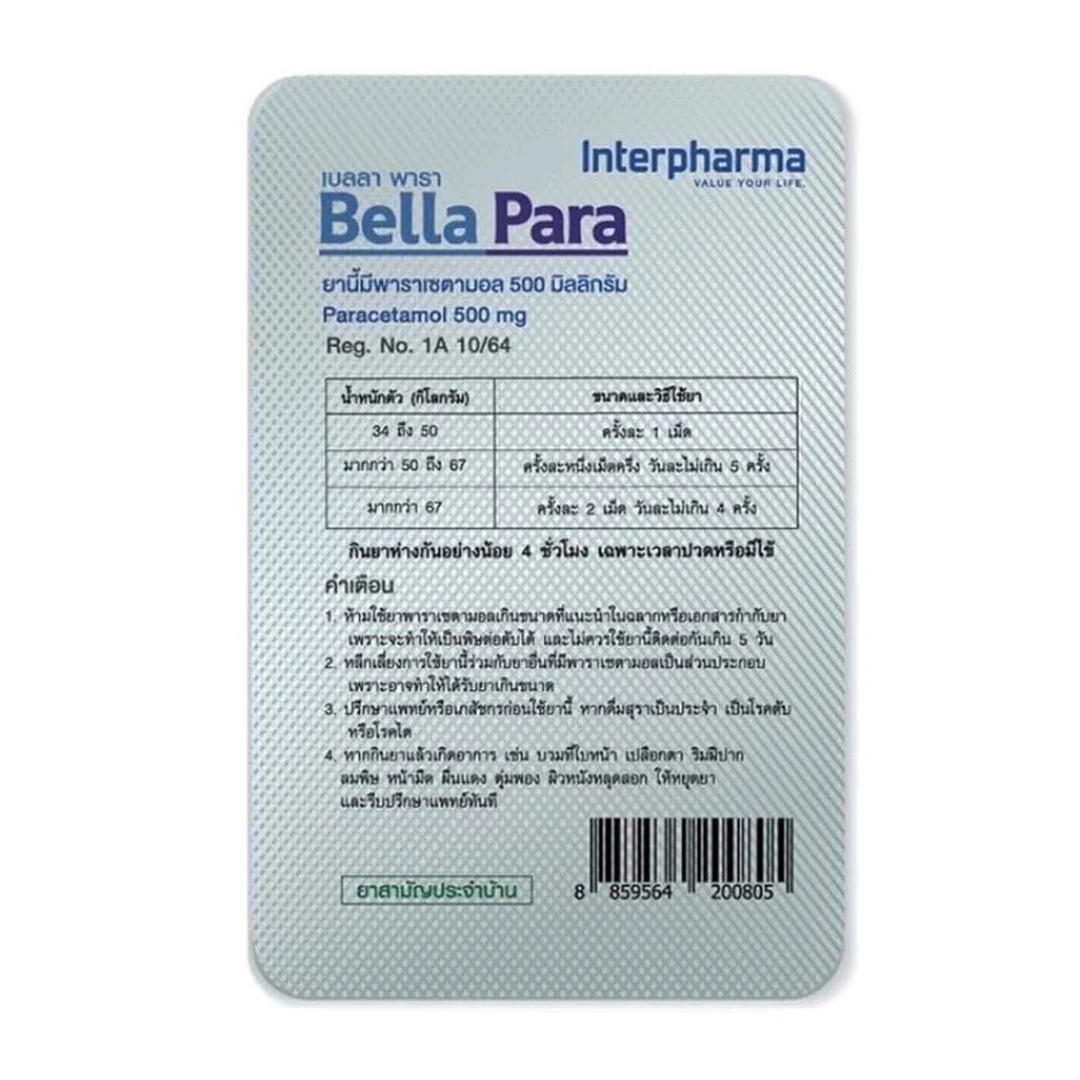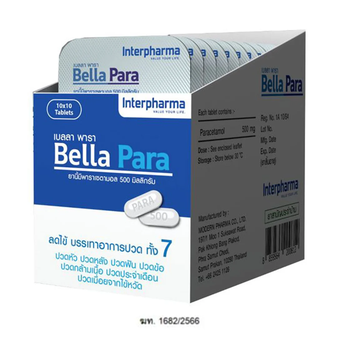 BELLA PARA Paracetamol 500 มก. บรรเทาอาการปวดเล็กน้อยถึงปานกลางและมีไข้ได้อย่างรวดเร็วและมีประสิทธิภาพ ช่วยบรรเทาอาการปวดหัว ปวดฟัน ปวดกล้ามเนื้อ ปวดข้อ ปวดประจำเดือน และอาการหวัดหรือไข้หวัดใหญ่ ความแรง 500 มก. ช่วยให้บรรเทาอาการได้อย่างมีประสิทธิภาพและอ่อนโยนต่อกระเพาะอาหาร
