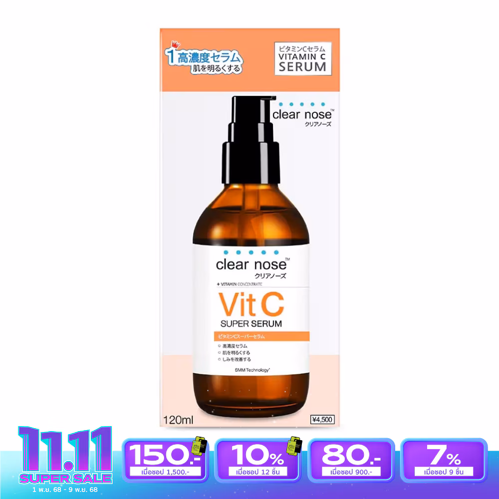 - เคลียร์โนส วิตามินซี คอนเซนเทรต ซูเปอร์เซรั่ม ผสานพลังอันทรงพลัง (วิตามินซี 5 ชนิด, อี, เฟอรูลิก และสารสกัดจากส้ม 3 ชนิด) ผสานพลังกันอย่างลงตัว ช่วยให้ผิวหมองคล้ำกระจ่างใส ลดเลือนริ้วรอย พร้อมปรับสีผิวและเนื้อผิวให้เรียบเนียนอย่างอ่อนโยน เซรั่มวิตามินซีเนื้อบางเบานี้บำรุงผิวอย่างล้ำลึก ลดเลือนรูขุมขน เผยผิวกระจ่างใส โดยไม่ทำให้ผิวแห้งตึง ด้วยเทคโนโลยี SMM (Smart Microsphere) ช่วยคงประสิทธิภาพของวิตามินซีและส่วนผสมอื่นๆ ได้อย่างมีประสิทธิภาพ ตรงเข้าจัดการปัญหาผิวของคุณได้อย่างตรงจุดพผิว