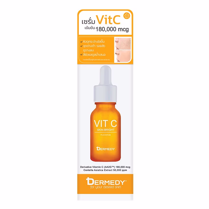 เดอร์เมดี้ วิตซี พลัส เซรั่ม เซรั่มบำรุงผิวหน้าสูตรเข้มข้น สูตรไวท์เทนนิ่งทางวิทยาศาสตร์ – อนุพันธ์วิตามินซีจากญี่ปุ่น (AA2G) ความเข้มข้น 180,000 ไมโครกรัม และสารสกัดจากใบบัวบก ความเข้มข้น 50,000 ppm