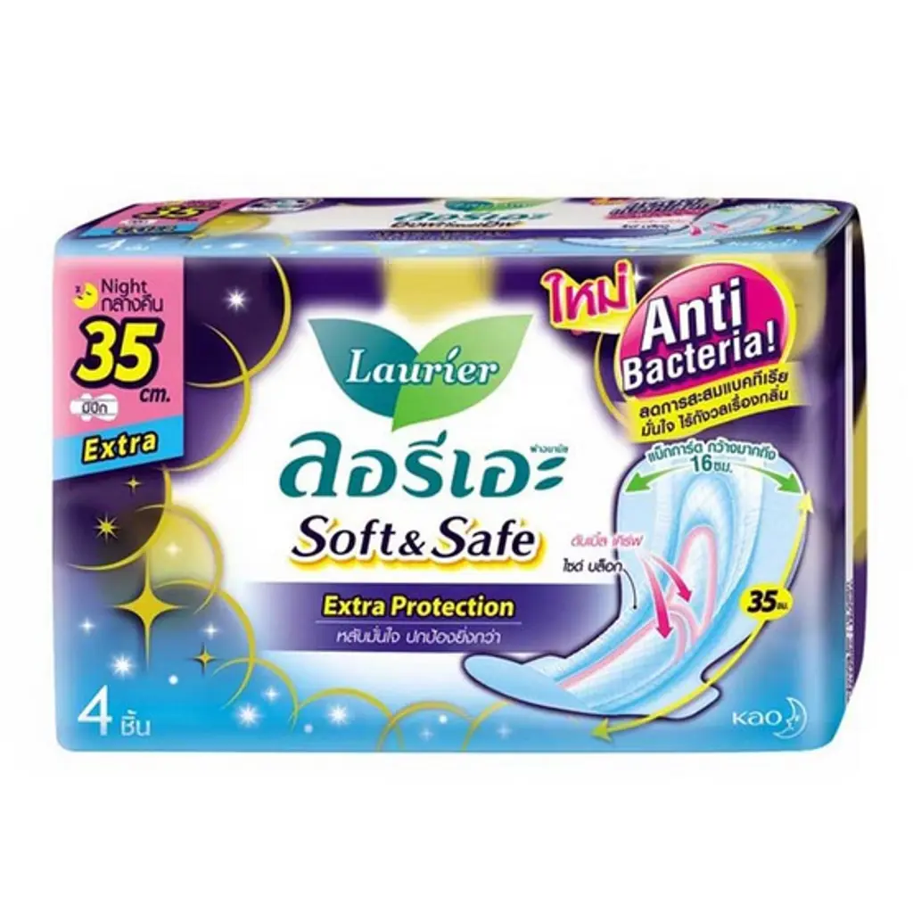 สัมผัสประสบการณ์การปกป้องข้ามคืนที่มั่นใจได้ด้วย Laurier Soft & Safe Night ขนาด 35 ซม. ออกแบบมาเพื่อการไหลเวียนโลหิตที่มากขึ้นและการปกปิดตลอดคืน แผ่นอนามัยนี้มีความยาวที่ยาวขึ้นและเทคโนโลยีดูดซับขั้นสูง ช่วยให้คุณตื่นขึ้นมาด้วยความรู้สึกแห้งสบาย
