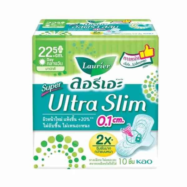 - Laurier Super Ultra Slim 0.1 Sanitary Napkins, 22.5 cm. Sleep soundly without worry, even if you turn over frequently. The ultimate in absorption at an ultra-thin 0.1 cm. Comfortable and confidently thin, like you’re not wearing anything. Absorbs up to 200 times, but at an ultra-thin 0.1 cm, with Wonder Gel Plus absorbent sheets packed with gel beads throughout the sheet. Exclusive to Laurier, it absorbs faster and provides superior dryness, even if your period is in clots. With a Power Square surface and Japanese technology that increases the absorption area, it doesn’t bunch up easily, fits the body with every movement, prevents backflow, prevents dampness, is soft and gentle on the skin.