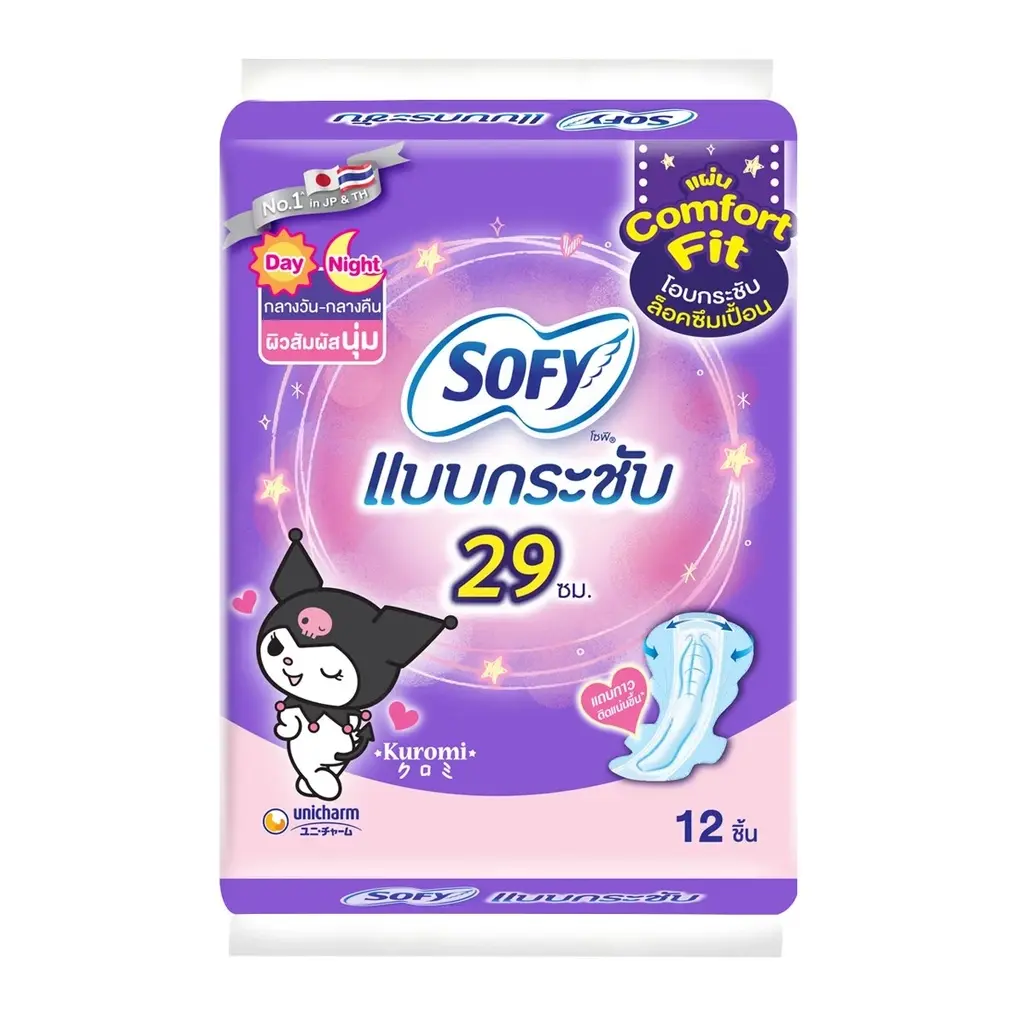 Sofy Body Fit Day & Night 29 ซม. ออกแบบมาเพื่อ ใช้ทั้งในเวลากลางวันและกลางคืน ให้การปกป้องที่เชื่อถือได้สำหรับประจำเดือนมาปานกลางถึงมากพร้อมความกระชับที่ยืดหยุ่นและกระชับพอดี